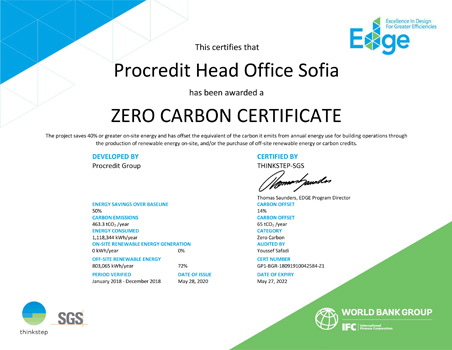 In May 2020, the head office of ProCredit Bank Bulgaria in Sofia was awarded a Zero Carbon Certificate under the EDGE building standard, making it the first building in Europe to receive the highest level of this type of certification.