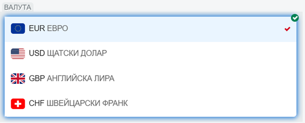 Валутата на разплащателната сметка може да бъде EUR, USD, GBP или CHF.