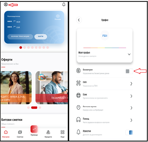 Ако мобилното Ви устройство поддържа тази функция, разрешете достъпа с биометрични данни през меню „Профил“ – „Биометрия“.